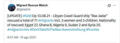 - Ras El Jadir 648: cattura di 71 persone migranti incluse 3 donne e 3 bambini. Nazionalità: Egypt 27, Ghana 8, Nigeria 9, Sudan 2 e Syria 25.