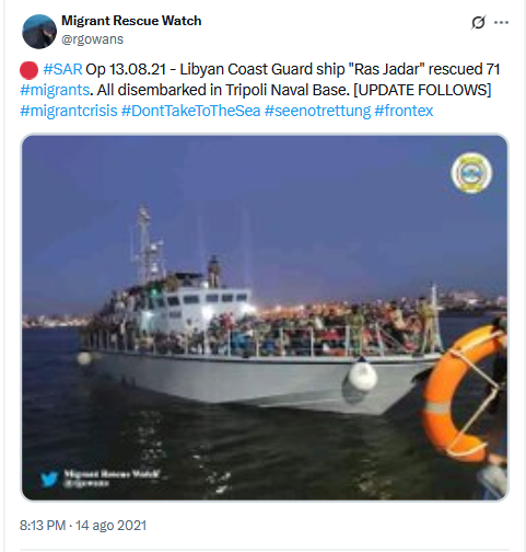 La fonte principale è il report del portavoce delle milizie libiche Rgowans al link https://x.com/rgowans/status/1426607973745451015 e https://x.com/rgowans/status/1426802642538348548. La fotografia postata è sicuramente di repertorio (infatti il numero della motovedetta è 656, Zawiya, e non 648, Ras El Jadir).