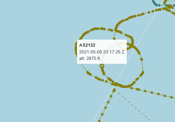 Tra le 22:43 e le 23:49 UTC: il drone spia di Frontex AS2132 sorvola in cerchio altri punti. Sono compatibili con le rotta delle barche n. 603468 e 603481.