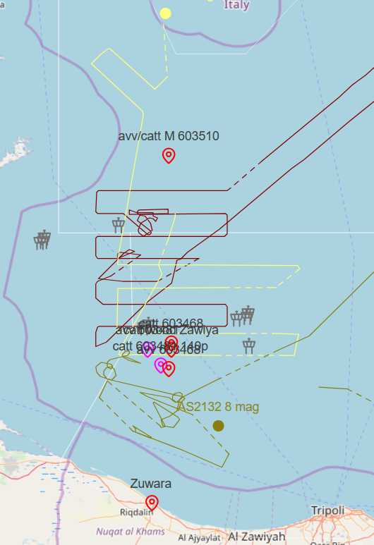Nella giornata del 8 maggio 2021 l’operazione Themis, con gli aerei di Frontex (MAS) avvista in mare due barche, che verranno catturate il giorno successivo e sbarcate a Tripoli: barca 603453 con circa 80 persone a bordo e barca 603501 con circa 50 persone a bordo. Dato lo sbarco a Tripoli, non sono attinenti a questo caso che ha come punto di sbarco il porto di Zawiya.
