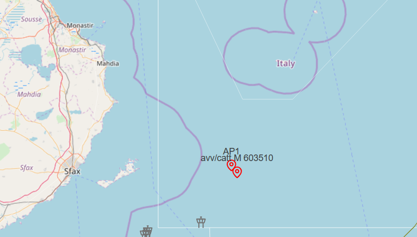 L’imbarcazione si trova in SAR maltese a coordinate 34.7833333, 12.133333333333335. La posizione corrisponde a quella della barca che verrà poi catturata nell’operazione Themis n. 603510.
