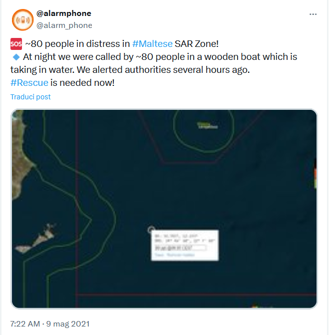 Notte tra 8 e 9 maggio 2021: Alarm Phone viene contattata da AP1, una barca con 80 persone a bordo. (Fonte: https://x.com/alarm_phone/status/1391262371633586180 ).