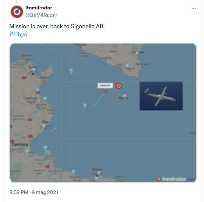 Ore 12:02 UTC: l’account Italmilradar segnala il decollo dalla base di Sigonella dell’aereo militare Italian Air Force ATR P-72A (reg. MM62280 – callsign IAM4101). La missione avviene a transponder spento. L’aereo torna a Sigonella alle 19 UTC. Fonte: https://x.com/ItaMilRadar/status/1391393080058728450