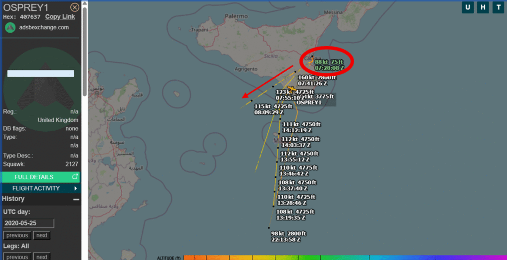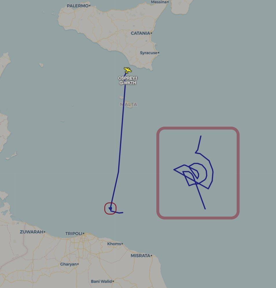 Nel lasso di tempo compreso tra le ore 11:00 UTC e le 12:30 UTC, il velivolo sembrerebbe aver sorvolato ripetutamente l’area in cui si trovava l’imbarcazione in difficoltà, fino a quando risulta aver disattivato il transponder.