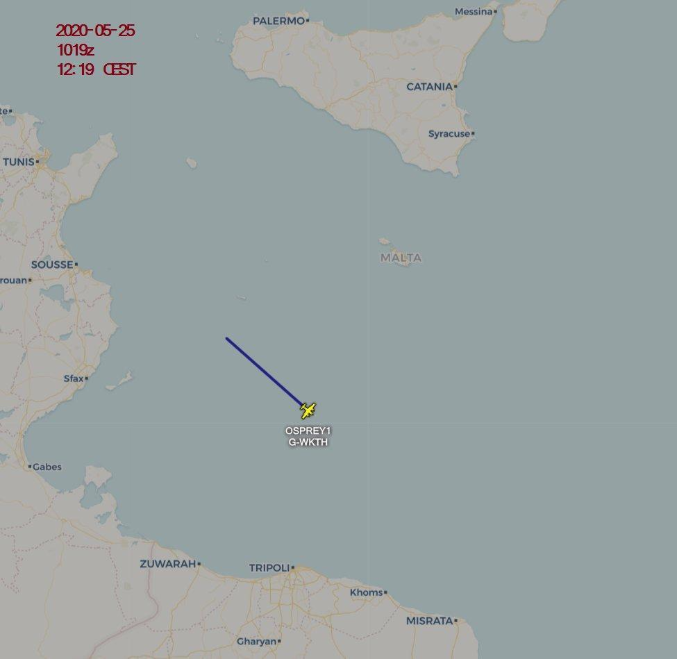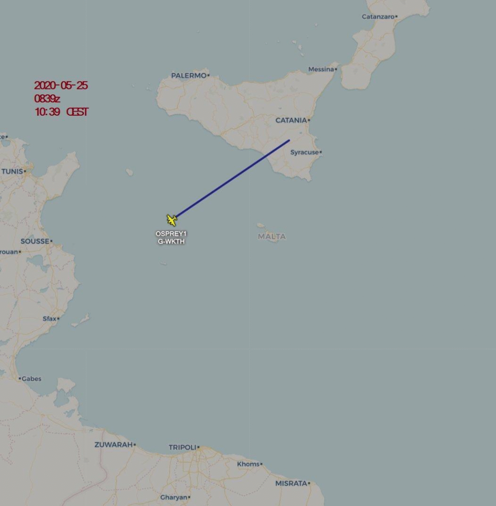 Ore 08:39 UTC (10:39 CEST) – L’aereo da ricognizione Frontex G-WKTH (Osprey 1) risulta in volo nello spazio aereo centrale del Mediterraneo, in una posizione intermedia tra l’isola di Malta e la costa orientale della Tunisia, approssimativamente all’altezza di Sousse.