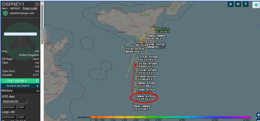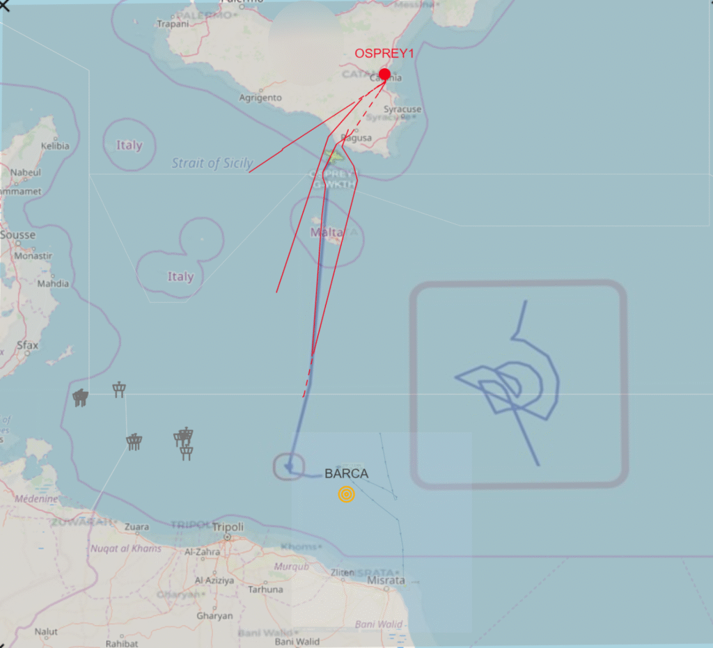 Attraverso l’analisi incrociata delle fonti disponibili e un lavoro di sovrapposizione delle immagini acquisite, è possibile affermare che il velivolo da ricognizione Osprey 1 ha sorvolato l’area in cui si trovava l’imbarcazione, orbitando in corrispondenza delle coordinate 33°34’N, 13°55’E, nel lasso di tempo compreso tra le ore 11:00 UTC e le ore 12:30 UTC.