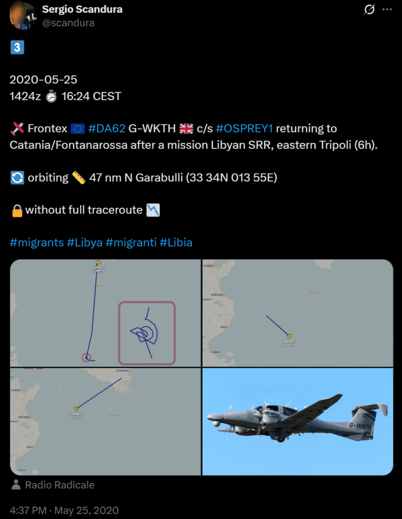 Ore 13:19 UTC (15:19 CEST) – L’aereo da ricognizione Frontex G-WKTH (Osprey 1) risulta già in volo verso nord, in direzione della Sicilia. Si trova a nord della città di Tripoli, evidenziando un progressivo allontanamento dall’area SAR libica.