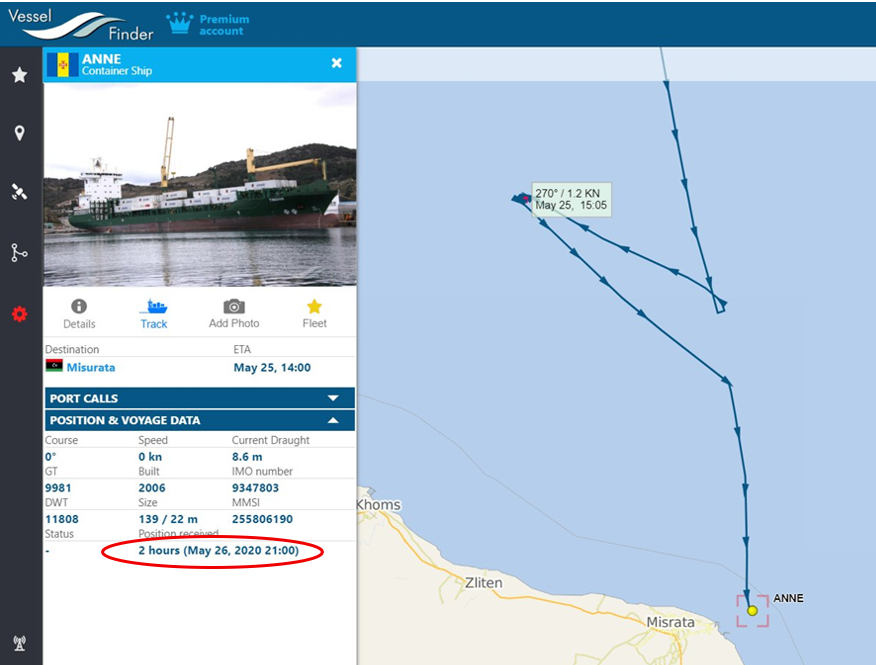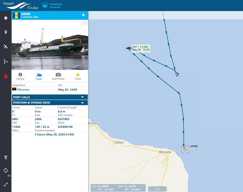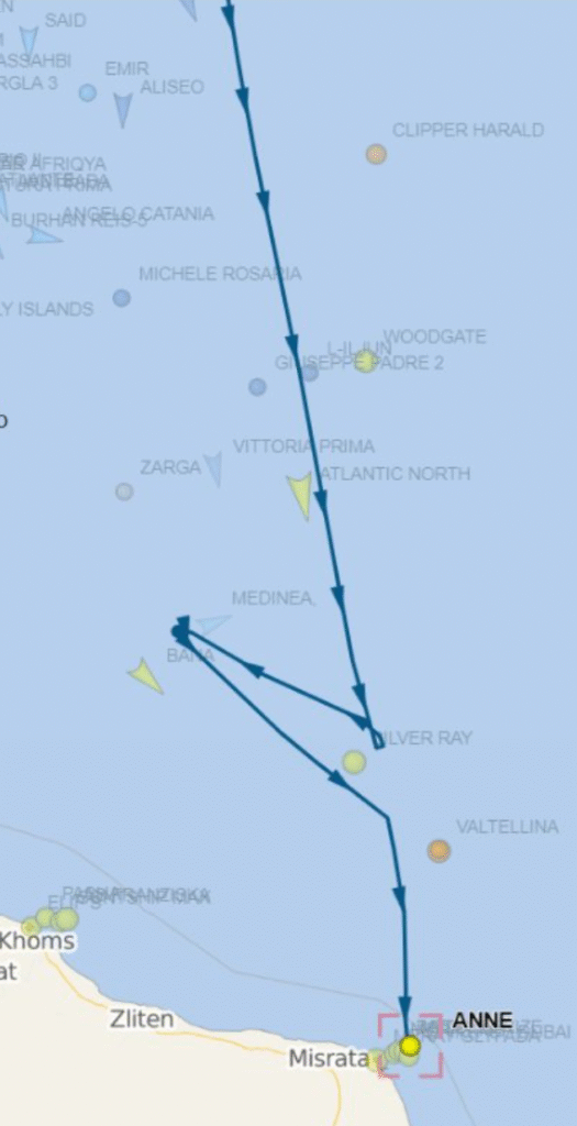 Ore 15:05 UTC (17:05 CEST) – La nave cargo MS Anne si trova dove è l’imbarcazione in difficoltà. Su ordine del Centro di coordinamento del soccorso marittimo (MRCC) di Malta, con l’indicazione di soccorrere i migranti e proseguire la navigazione verso la Libia. Come si evince dalla fonte sottostante, la rotta della MS Anne mostra prima l’avvicinamento all’imbarcazione e, successivamente, la direzione verso la Libia.