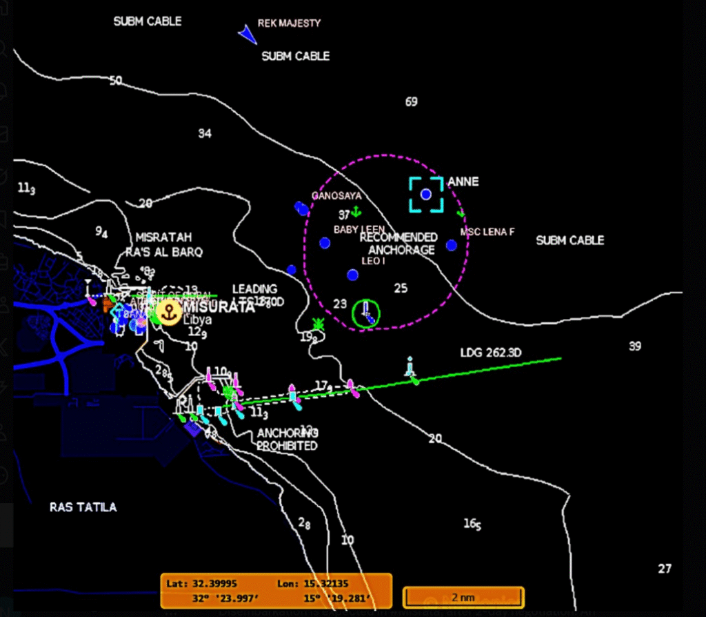 Ore 21:00 UTC (23:00 CEST) – La nave cargo MS Anne si trova nelle acque territoriali libiche, antistanti il porto di Misurata, dove è previsto lo sbarco delle 98 persone migranti presenti a bordo. La rotta seguita dall’imbarcazione, dal punto di cattura, risulta una navigazione diretta verso Misurata.