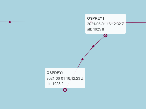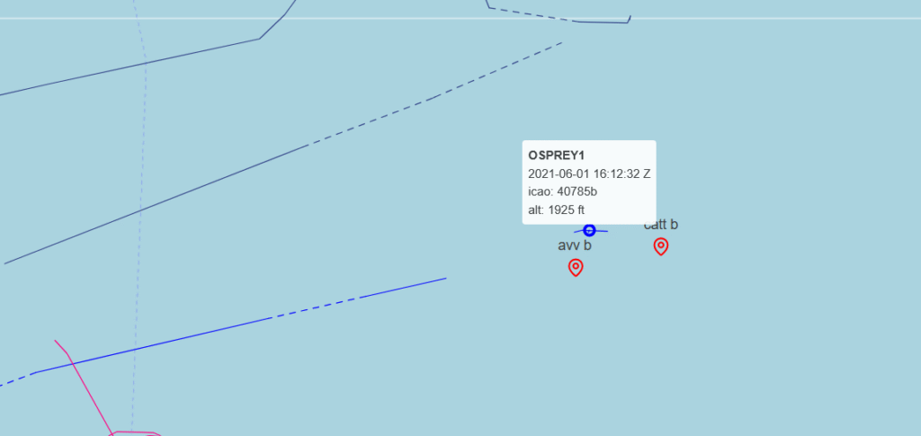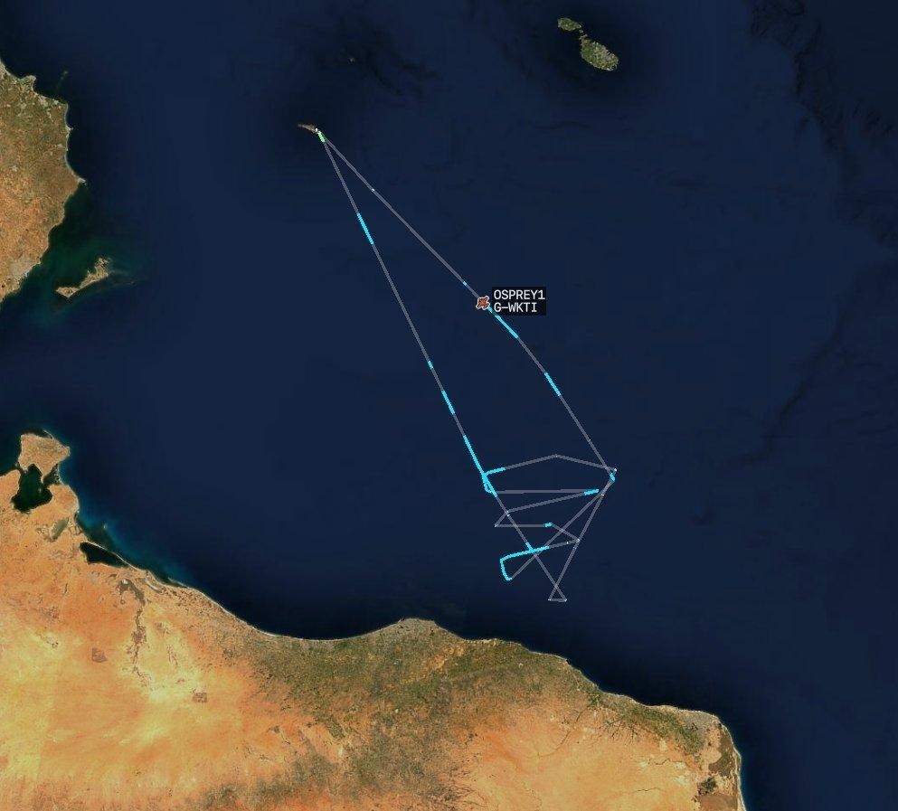 Alle ore 16:12 UTC il transponder dell’aereo spia di Frontex Osprey 1 con codice icao 40785b lo intercetta ancora mentre vola da sud a nord in un punto distante meno di 5 miglia dal punto di avvistamento del gommone poi segnato dall’operazione Themis. Sta probabilmente tornando verso nord dopo aver sorvolato l’imbarcazione.