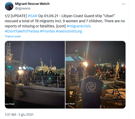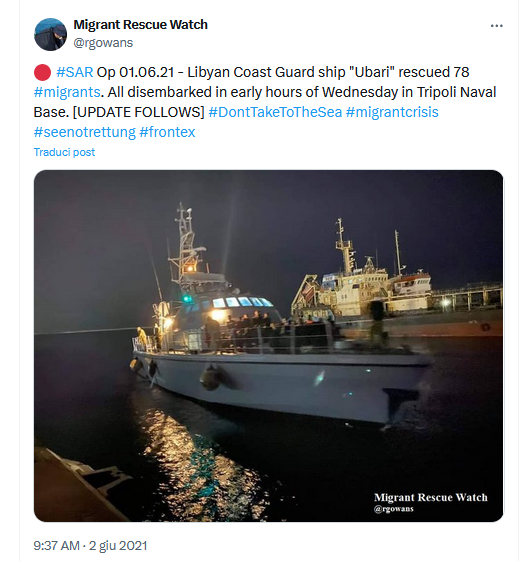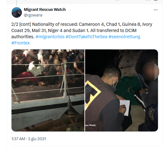 Fonte: Il portavoce delle milizie libiche Rgowans (Robert Brytan), il quale scheda il caso come “operazione SAR 01.06.21” e diffonde alcuni dati e 5 foto dello sbarco a Tripoli ai link https://twitter.com/rgowans/status/1399993550188781569