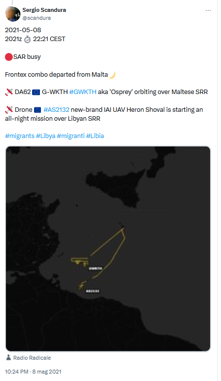 Ore 20:21 UTC: anche l’aereo spia di Frontex Osprey 1 GWKTH è in SAR libica e sembra aver individuato qualcosa in mare. (Fonti: Scandura al link https://x.com/scandura/status/1391126795764867079).