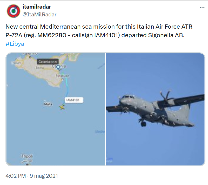 Ore 12:02 UTC: l’account Italmilradar segnala il decollo dalla base di Sigonella dell’aereo militare Italian Air Force ATR P-72A (reg. MM62280 – callsign IAM4101). La missione avviene a transponder spento. L’aereo torna a Sigonella alle 19 UTC. Fonte: https://x.com/ItaMilRadar/status/1391393080058728450