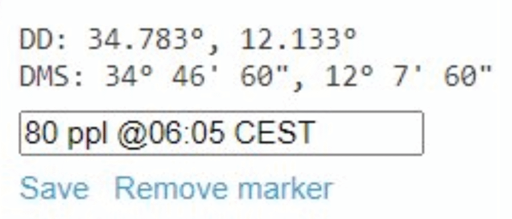 NOTA: Le 6 barche vengono schedate come wooden boat ma data la poca cura nell’inserire i dati che emerge dalle schede registrate da Themis il 12 maggio, pensiamo che sia un particolare da non tenere in considerazione e non escludiamo che in alcune operazioni siano stati catturati gommoni al posto di barche di legno. L’errore di scrivere wooden al posto di rubber, inoltre, è molto frequente negli impiegati italiani dell’operazione Themis che lavorano dal quartier generale di Pratica di Mare (Roma): essi guardano le foto aeree scattate dagli aerei di Frontex e spesso non riconoscono il tipo di barca perché le persone migranti spesso viaggiano sedute a cavalcioni dei tubolari dei gommoni e dall’’alto si vede un bordo stretto, più simile a quello di una barca di legno.