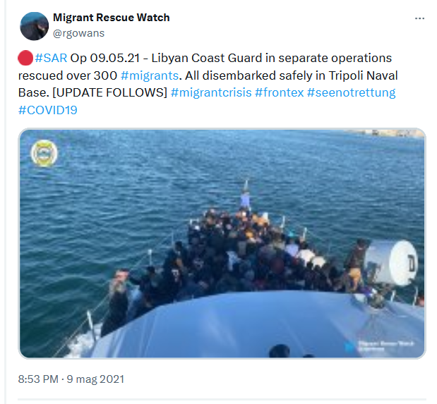 - Caso A – Op 09.05.21 A – Fezzan: 291 persone (forse 8 sono donne) su diverse barche catturate dalla motovedetta Fezzan 658 e sbarcate a Tripoli prima del tramonto. Fonte: https://twitter.com/rgowans/status/1391466450024603653 e https://x.com/rgowans/status/1391606020594569223