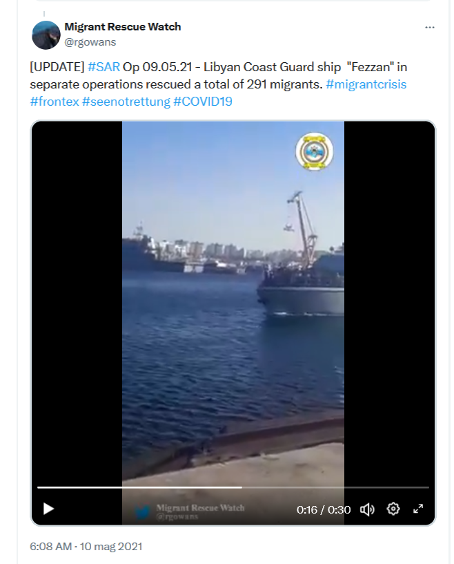 In un successivo tweet al link https://x.com/rgowans/status/1391606020594569223 posta il video dell’arrivo in porto della motovedetta Fezzan 658. Nel video si vede il numero della motovedetta.