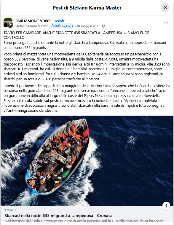 Vatican News al link https://www.vaticannews.va/it/mondo/news/2021-05/lampedusa-migranti-sbarchi-parroco-numeri-governo-draghi.html?utm_source=chatgpt.com: “Intanto il portavoce del capo di stato maggiore della Marina libica fa sapere che la Guardia costiera ha soccorso nella giornata di ieri 291 individui di diverse nazionalità su un gommone in difficoltà al largo delle coste del Paese. Nella nota si precisa che “appena completata l’operazione di soccorso, le persone sono sbarcate nella base navale di Tripoli”.