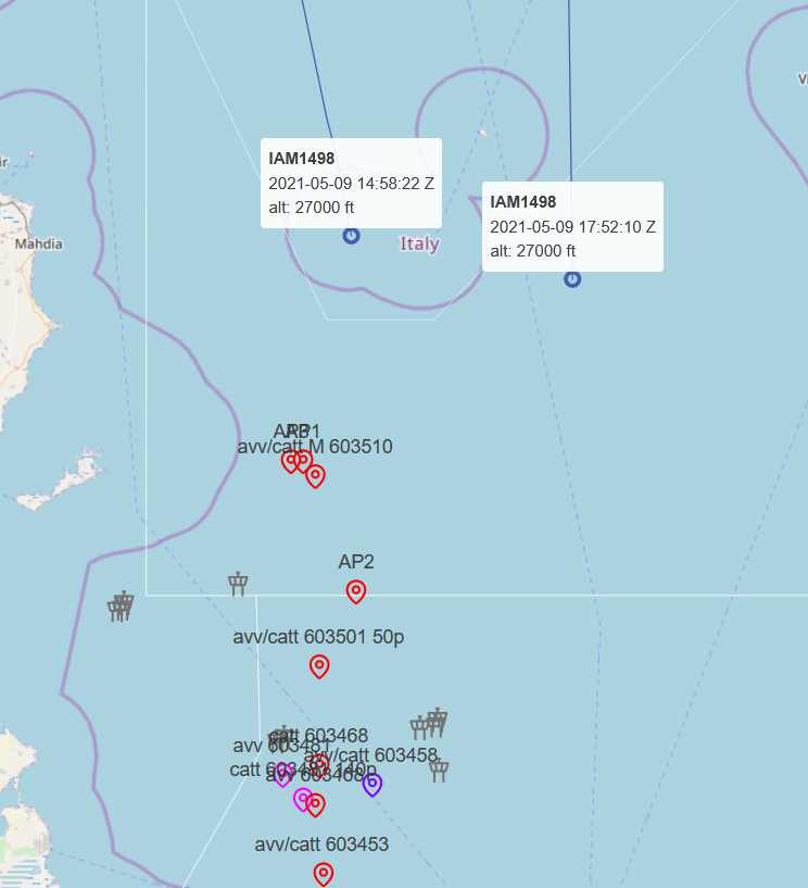 - AP2: 55 persone CATTURATE. Contatti persi alle 7:30 UTC del 9 maggio. Arrivate in SAR maltese e lì probabilmente catturate. Potrebbe corrispondere a operazione Themis n. 603501.