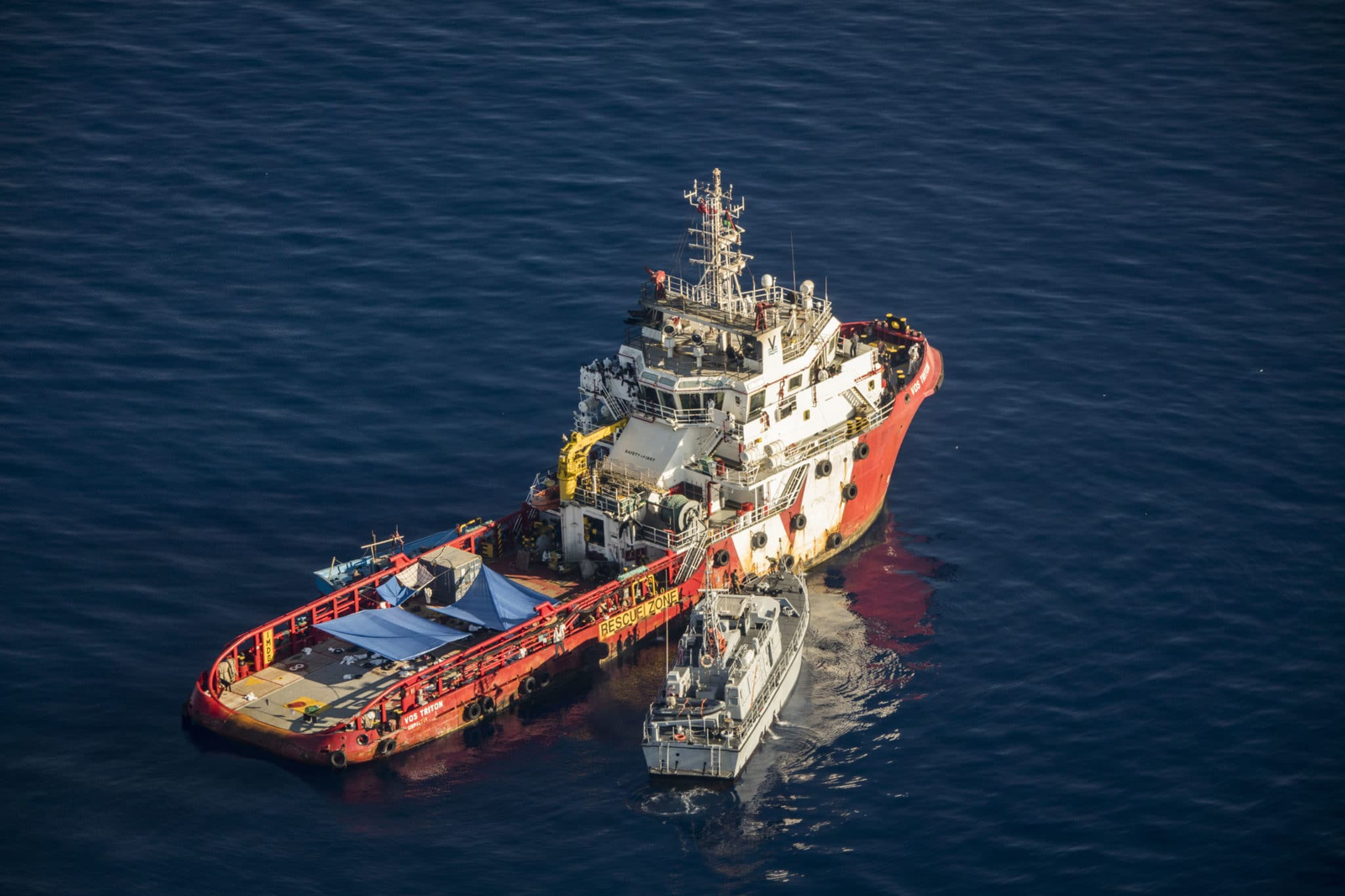 (14:35 CEST), più di un’ora dopo il suo arrivo, la Vos Triton riesce finalmente a legare la barca con una cima e a prendere tutte le persone a bordo.