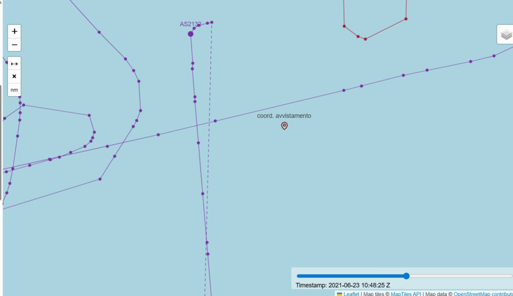 Note del JLP: Riteniamo che l’avvistamento da parte del drone Frontex AS2132 possa essere avvenuto tra le ore 10:48 UTC e le 10:50 UTC