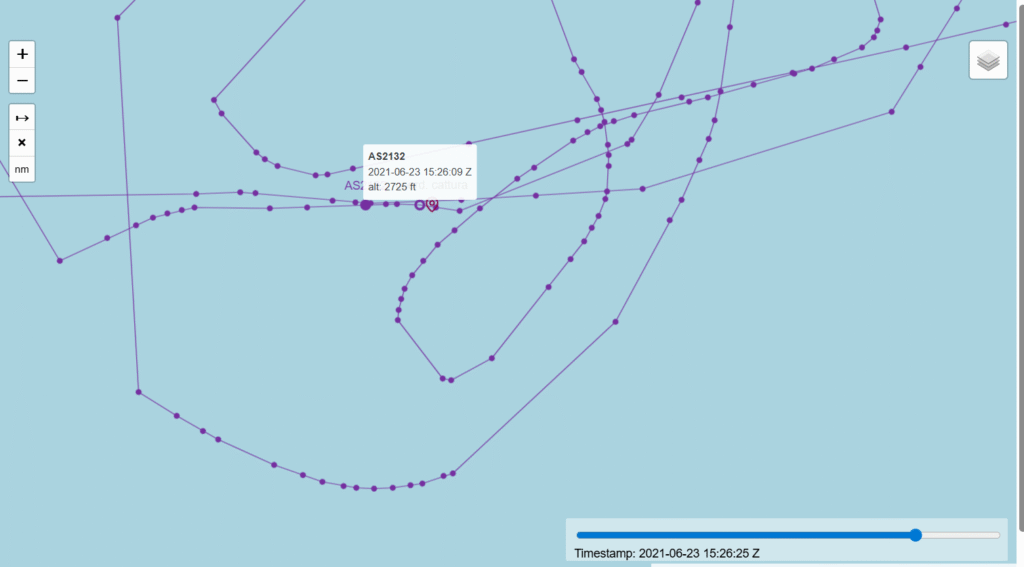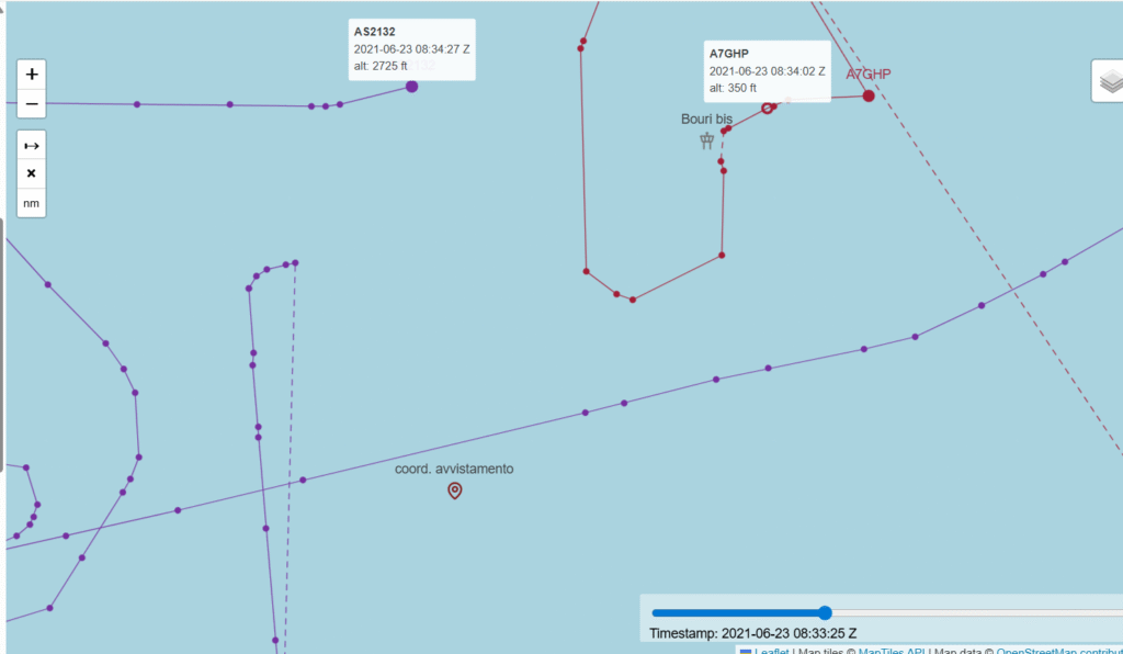 ore 08.34 UTC (ore 10.34 CAT): il drone di Frontex AS 2132 e l’elicottero AW 139 A7-GHP si incontrano sulla stessa traiettoria. Dopo l’incrocio con il drone Frontex, l’elicottero torna a Tripoli – foto 5