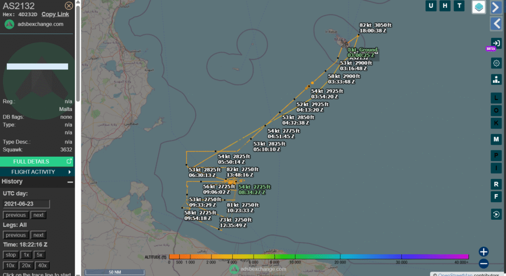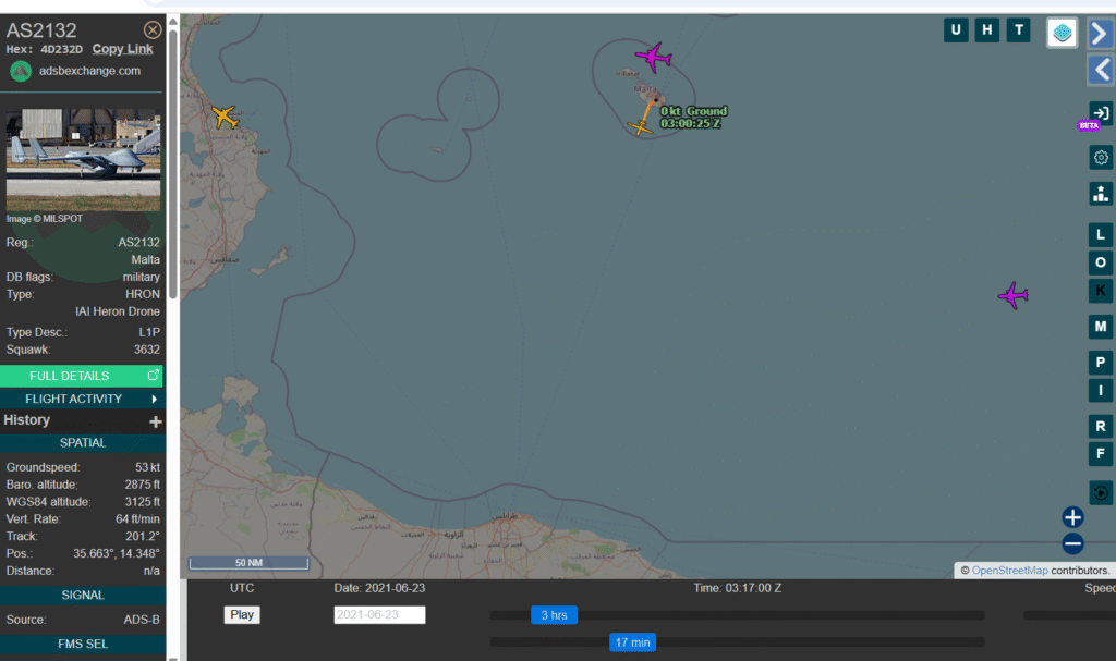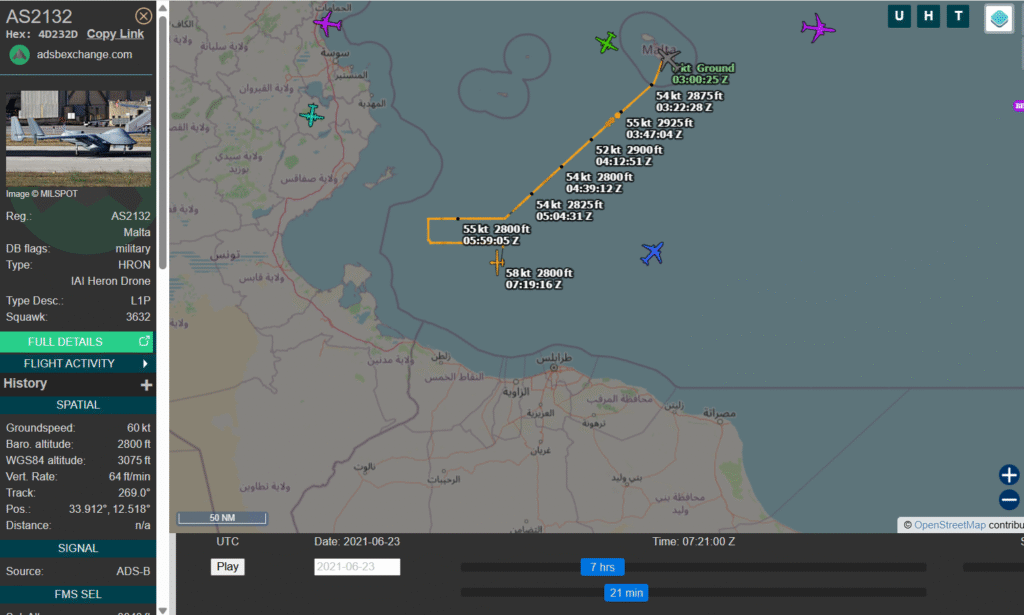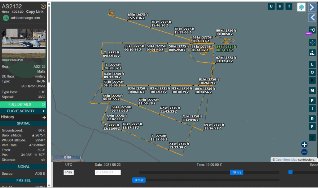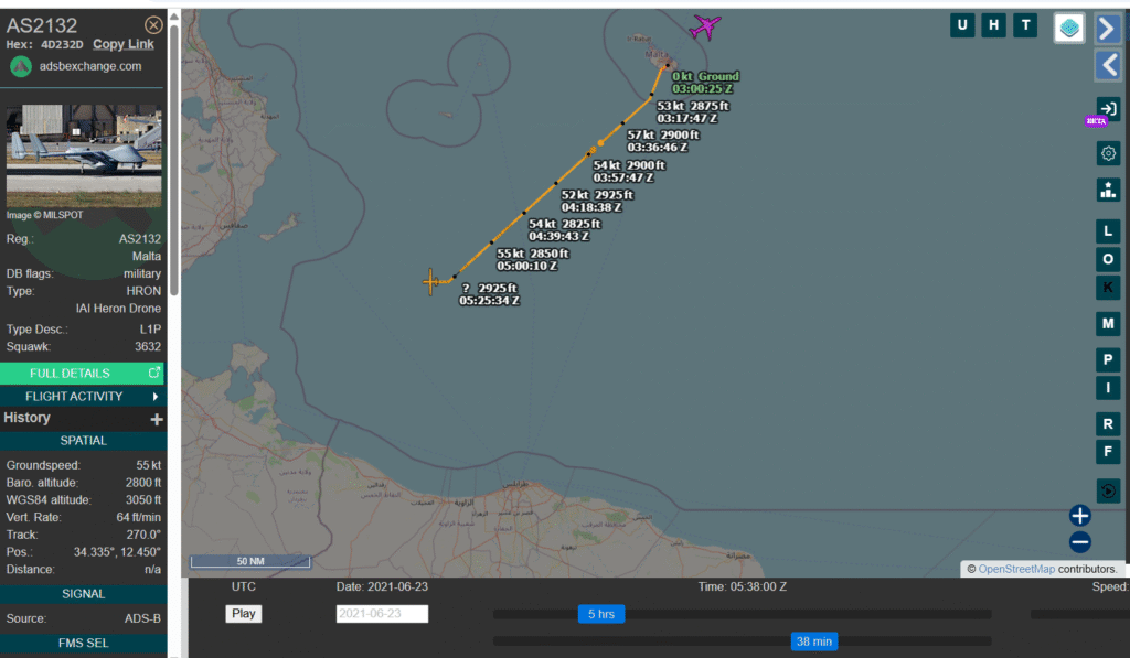 ore 03.00 UTC (ore 05.00 CAT): Il drone spia di Frontex IAI Heron AS2132 con codice ICAO 4D232D lascia la base di Malta ed inizia la sua missione di ricognizione: (fonte https://globe.adsbexchange.com/?icao=4d232d&lat=34.469&lon=13.645&zoom=7.5&showTrace=2021-06-23&trackLabels ) foto 1