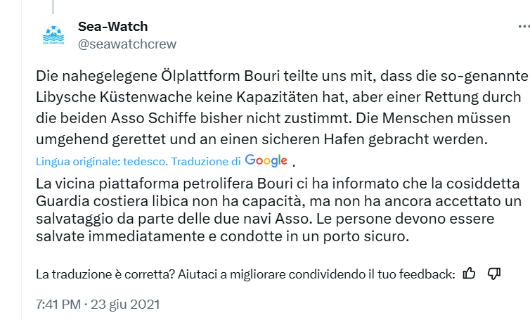 ore 17.41 UTC (ore 19.41 CAT): Sea Watch pubblica un post in cui si legge chiaramente che nessuno ha ancora provveduto al salvataggio delle persone in mare (fonte: https://x.com/seawatchcrew/status/1407755690039562243 ) – foto 9