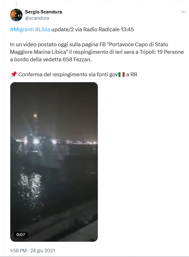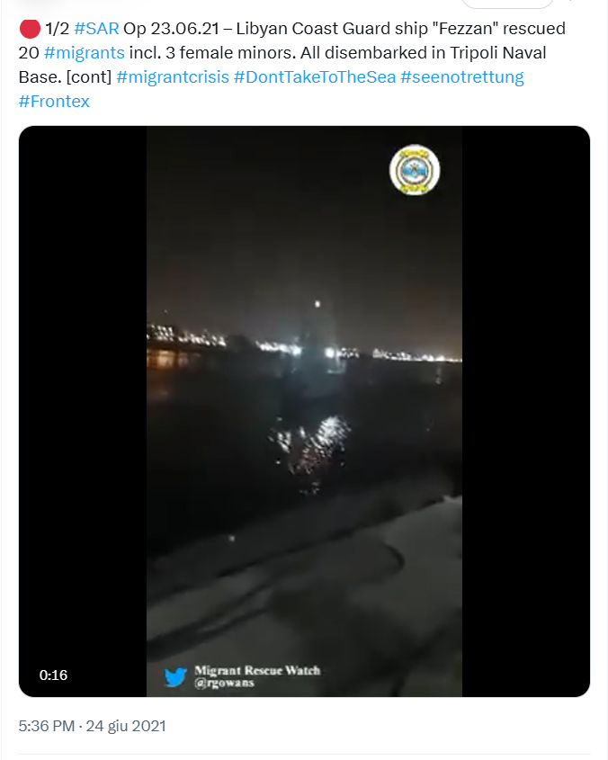 Il 24 giugno viene twittato un post che contiene il video dell’arrivo al porto di Tripoli (fonte: https://x.com/rgowans/status/1408086534457282560 ).