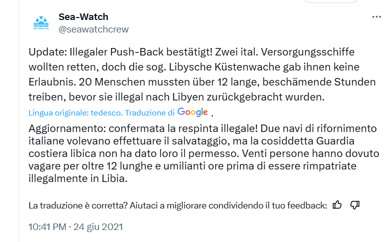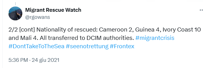 ore 21.41 UTC (ore 23.41 CAT): Sea Watch posta un aggiornamento su twitter in cui dice che è avvenuto il respingimento illegale delle 20 persone dopo aver vagato per oltre 12 ore in mare (fonte: https://x.com/seawatchcrew/status/1408163317785432071 ) – foto 12