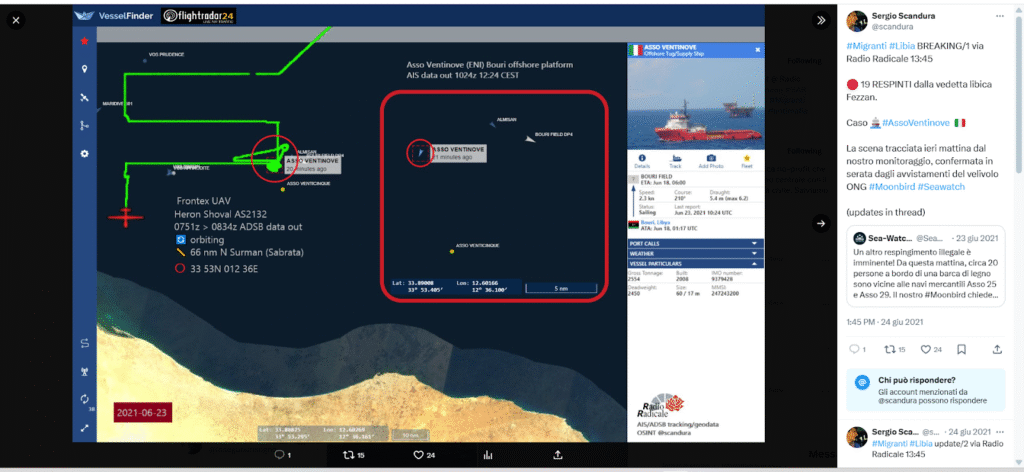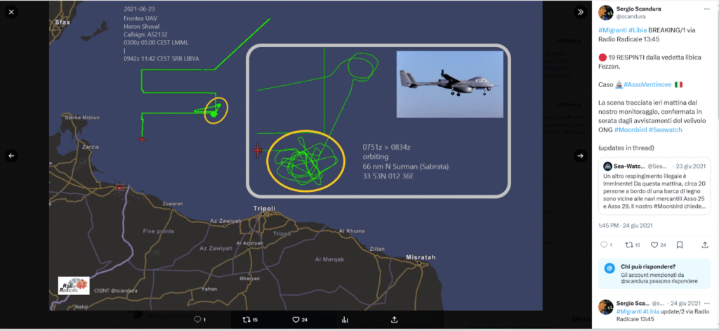 Il respingimento è iniziato ad opera dell’avvistamento da parte di un assetto aereo Frontex ovvero del drone spia Frontex IAI Heron AS2132 con codice ICAO 4D232D (fonte https://globe.adsbexchange.com/?icao=4d232d&lat=34.514&lon=12.858&zoom=7.6&showTrace=2021-06-23&trackLabels)