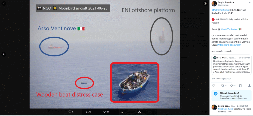 Il 23.06, l’equipaggio di Moonbird avvistò circa 20 persone nella zona SAR libica. Le navi mercantili Asso Ventinove e Asso Venticinque, entrambe battenti bandiera italiana, si trovavano rispettivamente a 2 e 7 miglia nautiche dalle persone. Nessuna delle due navi rispose ai tentativi di comunicazione via radio dell’equipaggio di Moonbird. La nave mercantile Almisan, battente bandiera italiana, si trovava nei pressi della piattaforma petrolifera Sabratha e rimase anch’essa priva di risposta. Successivamente, la piattaforma petrolifera Bouri informò via radio l’equipaggio di Moonbird che stavano aspettando la cosiddetta Guardia Costiera libica per incaricare una nave di effettuare il soccorso, probabilmente in qualità di autorità “competente”.