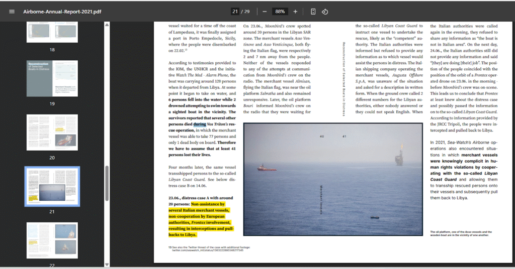 Dal report annuale di Sea Watch scopriamo tutto quello che è realmente accaduto a queste 20 persone: https://sea-watch.org/wp-content/uploads/2022/05/Airborne-Annual-Report-2021.pdf – foto 17