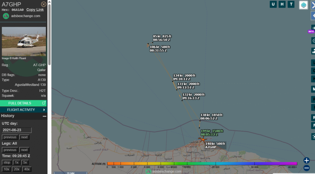 ore 08.05 UTC (ore 10.05 CAT) l’elicottero Augusta Westland 139 A7-GHP con codice ICAO 06A1A0 decolla dalla Libia – (utilizzato, fra le altre cose, anche per il monitoraggio marittimo e le operazioni di ricerca soccorso – SAR) ed arriva alla piattaforma della Mellitah Oil & Gas per poi tornare a Tripoli. Lo Stato Italiano tramite il ministero dell’economia detiene il controllo effettivo di Eni, che a sua volta detiene il 50% delle quote di Mellitah Oil & Gas, società per la quale presta servizio l’elicottero in questione.