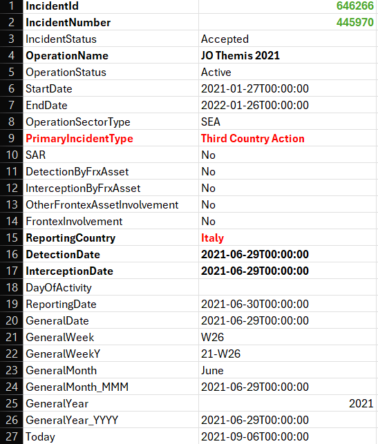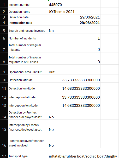 Questa è una operazione Themis (Incident ID/incident number: 646266/445970), gestita dal governo italiano e dall’agenzia Frontex, schedata sul database Jora. È un respingimento illegale avvenuto in acque internazionali.