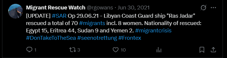 Anche il profilo X di @rgowans pubblica tweet fornendo maggiori informazioni sulle persone migranti a bordo del gommone. https://x.com/rgowans/status/1410332609280892930