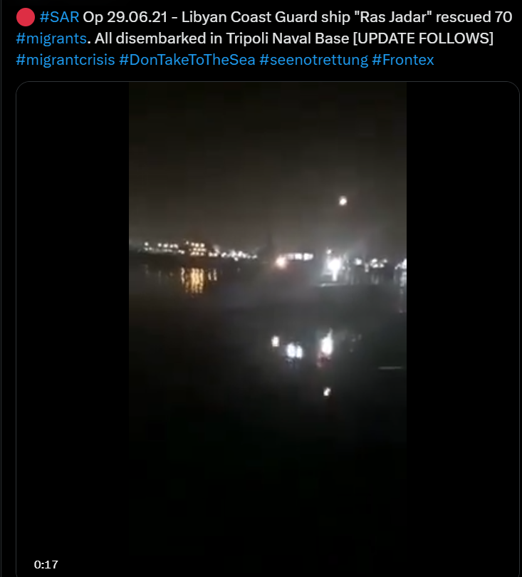 Il 30 giugno 2021, alle ore 14:19 CEST, @rgowans posta su X (ex Twitter) un video dello sbarco. Si tratta di uno sbarco notturno effettuato presso la base navale di Tripoli. Tra i migranti vi sono 8 donne.