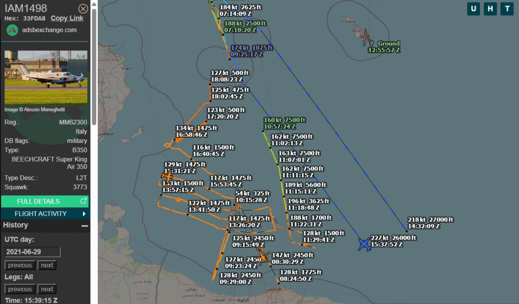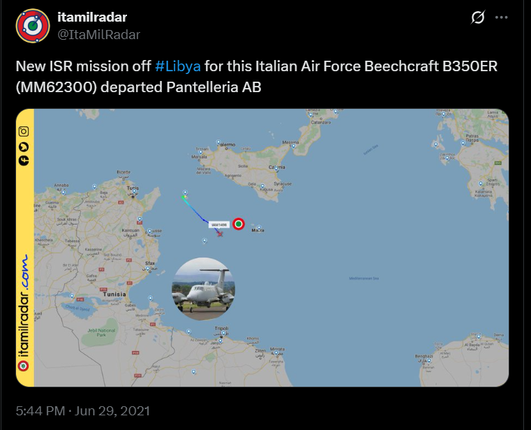 Alle ore 13:27 UTC: l’aereo militare italiano IAM1498 decolla dall’isola di Pantelleria. Italian Air Force Beechcraft B.350ER SPYDR (reg. MM62300 – callsign IAM1498) è un velivolo utilizzato dall’Aeronautica Militare per le attività di sorveglianza e ricognizione al largo della Libia (cd. missione ISR).