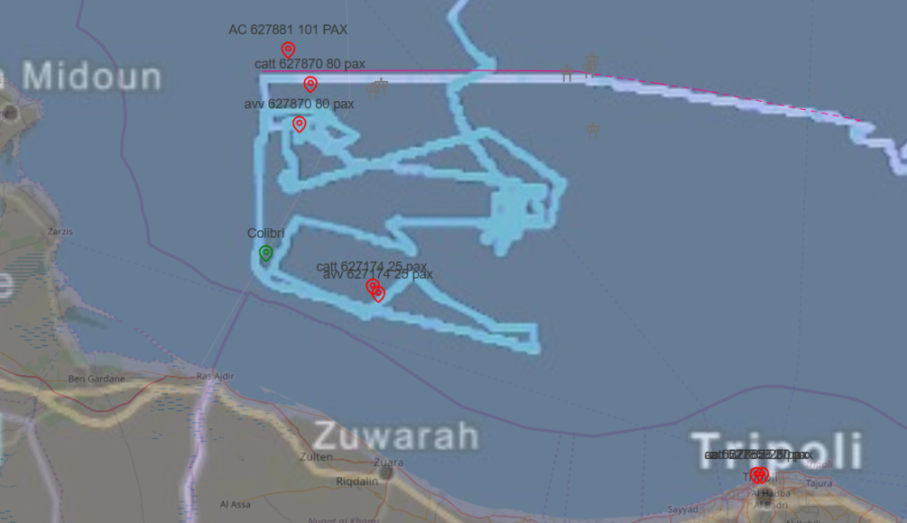 11:11 UTC: Frontex’s surveillance drone AS2132 flew in circle over a third point with coordinates 33.559707, 12.444215. (Source: Scandura https://x.com/scandura/status/1402929208138076165 )