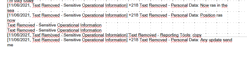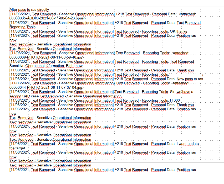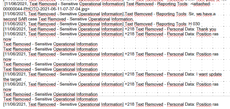 L’organizzazione tedesca Frag den Staat ha ottenuto prove relative alla comunicazione diretta tramite messaggi WhatsApp tra Frontex e la scLCG tra il 18 maggio e il 14 giugno 2021. Nella trascrizione dei messaggi, la maggior parte delle informazioni è stata rimossa da Frontex, in quanto l’agenzia le ha classificate come “dati operativi sensibili”. Tuttavia è possibile osservare uno scambio di messaggi tra Frontex e un numero +218, il prefisso internazionale della Libia. Dato il contesto, è possibile dedurre che si tratti di un numero appartenente a un attore libico, probabilmente la scLCG. In diversi scambi del 18 maggio, 27 maggio, 11 giugno, 12 giugno e 14 giugno 2021, vengono condivisi audio, foto, posizioni, avvistamenti di imbarcazioni o possibili casi di pericolo, da cui si evince la collaborazione tra le due entità nelle intercettazioni in mare. (Fonte: https://www.ecchr.eu/fileadmin/Redacted_Article_15_Communication_to_the_ICC__Situation_in_Libya_Interceptions_of_Migrants_and_Refugees_at_Sea_as_Crimes_Against_Humanity.pdf).