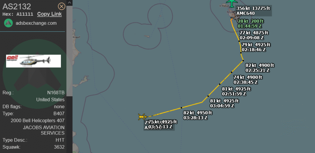Ore 01:44 UTC: Il drone spia di Frontex AS2132 decolla da Malta per una missione di ricognizione in SAR libica. Vola velocemente sopra tutta la SAR maltese, dove evidentemente non ha interesse ad individuare imbarcazioni. Alle 03:12 UTC arriva in SAR libica.