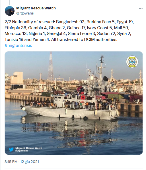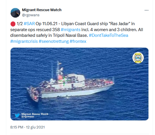 Prima della 18:14 UTC : sbarco a Tripoli. Il portavoce delle milizie libiche Rgowans pubblicherà poi su Twitter al link https://x.com/rgowans/status/1403778014828273664 una foto dello sbarco a Tripoli della motovedetta Ras El Jadir 648 (si vede il numero) con a bordo le persone migranti che ha catturato nella giornata. Sia secondo i libici, sia secondo l’operazione Themis, le persone respinte sono 358.