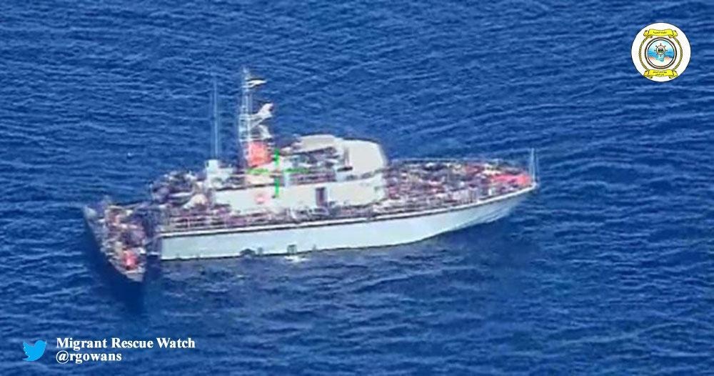 Analisi di JLProjectQuesta foto è compatibile con la cattura della barca n. 628306 con a bordo 94 persone. La barca è grande, a prua si vede un  gran numero di persone migranti probabilmente già catturate in precedenti operazioni. La luce è compatibile.